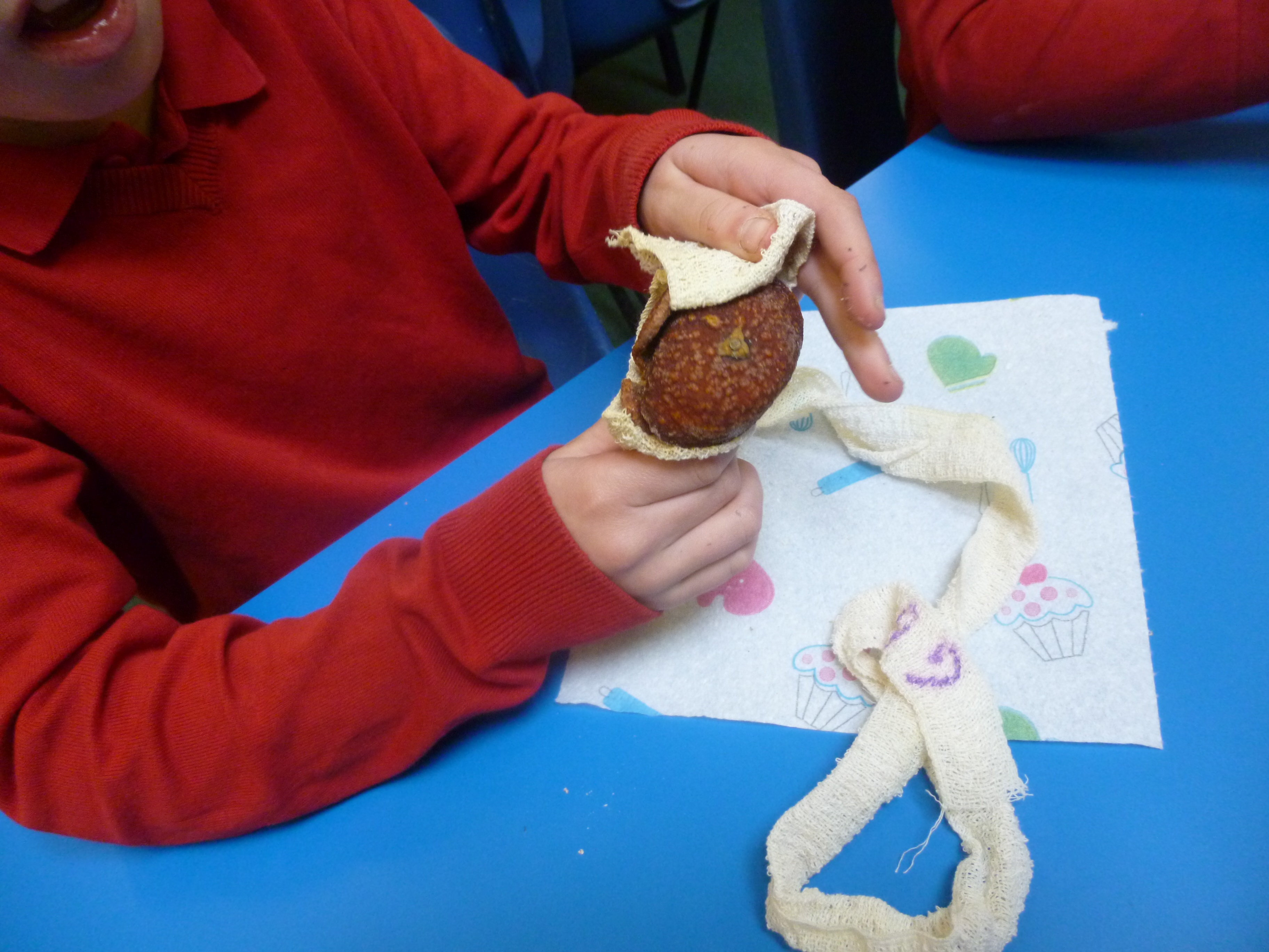During our learning about the Ancient Egyptians, we discovered the mummification process. We were so fascinated (and a little disgusted) that we wanted to try out the process ourselves! After scooping out the ‘guts’ of the orange and drying it out with paper towels, we used a mixture of bicarbonate of soda and salt to make natron and added cinnamon and cloves. We then wrapped our oranges tightly in bandages and left them in a warm dry place. The photos show the the unwrapping and results!